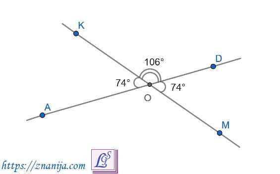 Вертикальные углы равны. ∠KOA = ∠MOD = 148° : 2 = 74°
