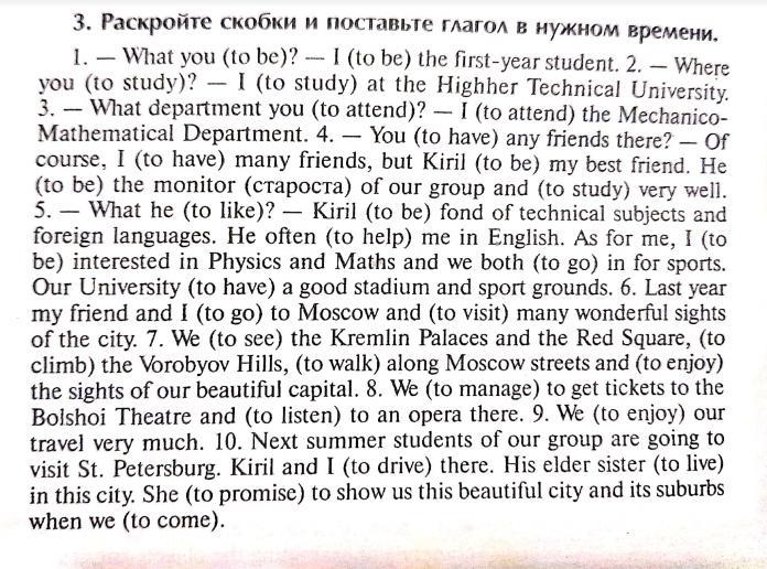 1.What you are? I am the first year student.2 Where are you study?I study at Highter Technical University.3.What department are you attend?I attend the Mechico Mathematical Department.4.Have you any friends there?Yes,of course have many friends.5.What is he like?-Kirill was fond of technical subjects and foreign languages.He often helps me in English.As for me,I am interested in Physics and Math and we both went to sports.Our university had a good stadium and sport ground.Last year my friend and I went to Moskow and visited many wonderful sights of the city.We saw the Kremlin Palaces and Red square climbed Vorobyov hills ,walked along Moskow streets and enjoyed the sights of our beautiful capital.We managed to get tickets to Bolshoi Square and listened to an Opera there.We enjoyed our travel very much.Next summer students of our group are going are going to visit St.Petersburg.Kirill and I drove there.His elder sister lived in this city.She promised to show us this beautiful city and its suburbs when we came.