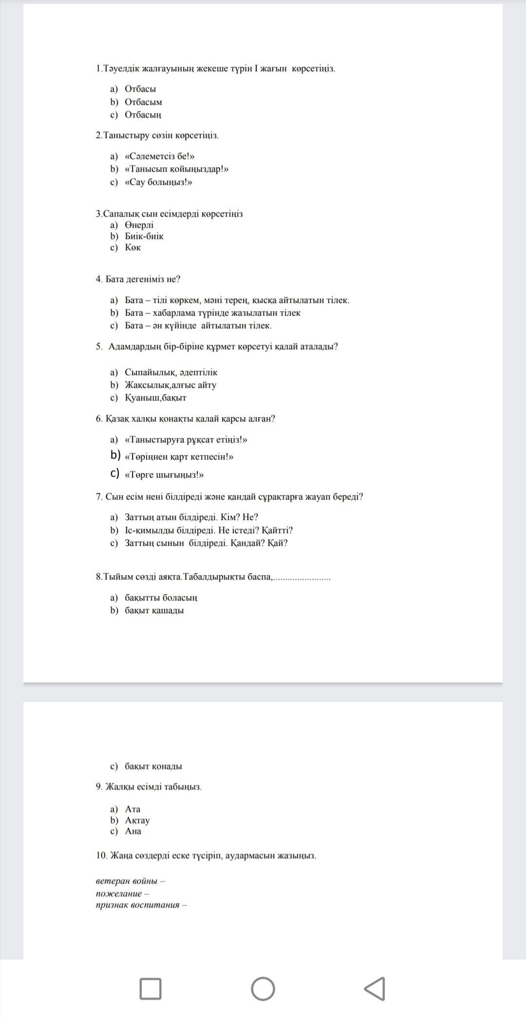 1)b ; 2)b ; 3)a ; 4)a ; 5)a ; 6)c ; 7)c ; 8)b ; 9)b ; 10) ветеран войны-соғыс ардагері; пожелание-тәлектер; признак воспитания-тәрбиенің белгісі
