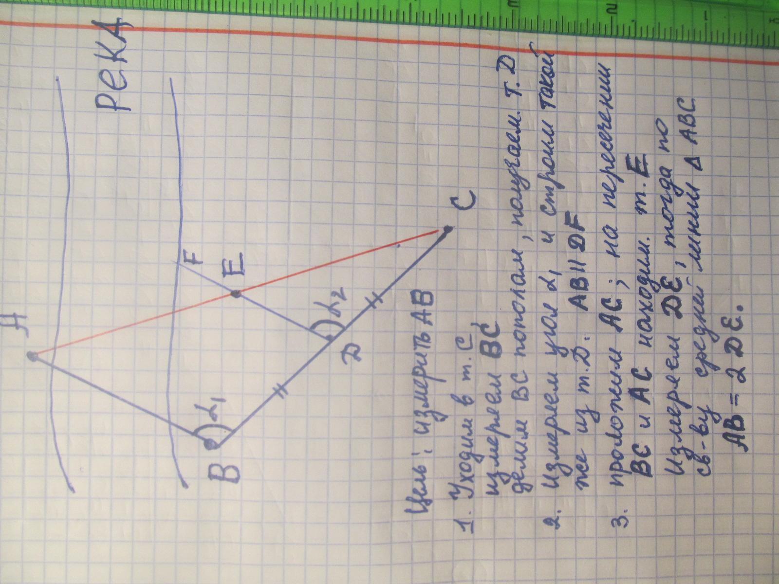 Как использовать свойство средней линии треугольника для определения расстояния между двумя пунктами, расположенными на разных берегах реки?