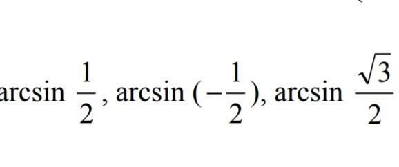 arcsin\frac{1}{2}= \frac{\pi }{6} \\arcsin\frac{-1}{2}= \frac{-\pi }{6} \\arcsin\frac{\sqrt{3} }{2} =\frac{\pi }{3}