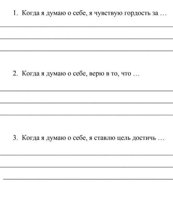Верите ли вы в себя? Чтобы узнать это, завершите предложения: 1. Когда я думаю о себе, я чувствую гордость за …
