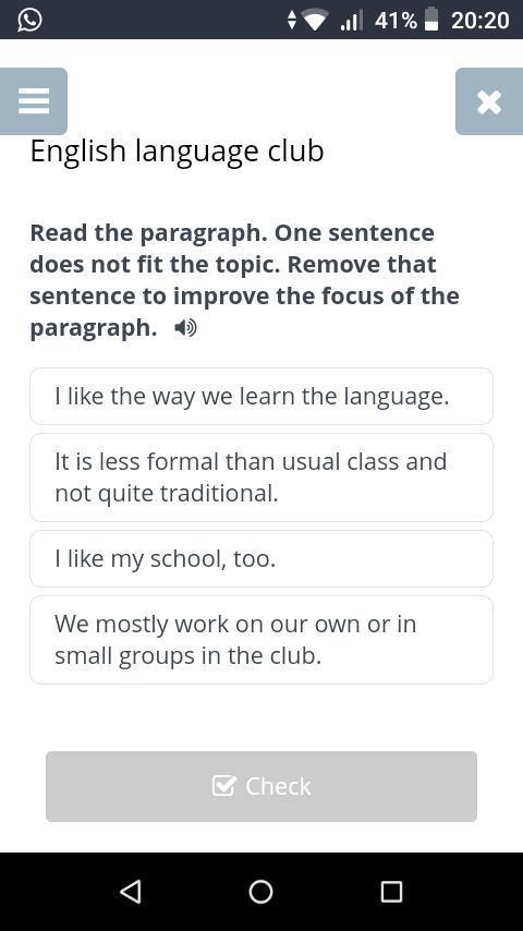 English language club Read the paragraph. One sentence does not fit the topic. Remove that sentence to improve the focus of the paragraph. I like the way we learn the language. It is less formal than usual class and not quite traditional. I like my school, too. We mostly work on our own or in small groups in the club.