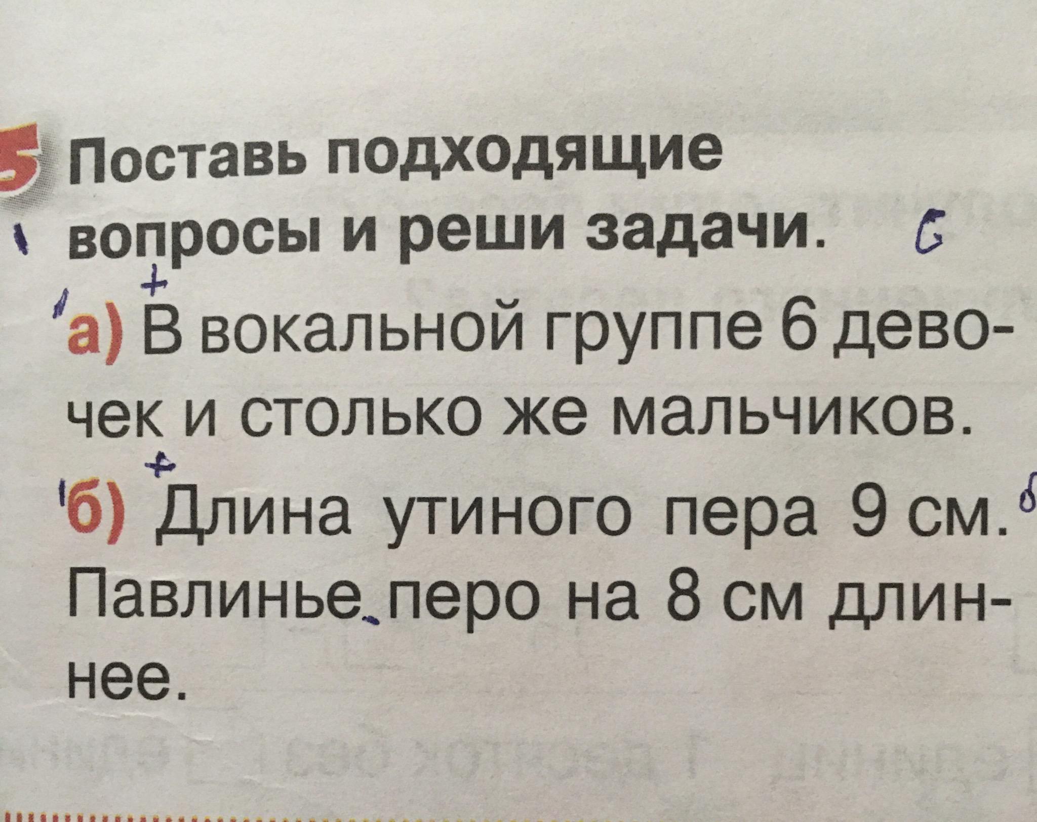б) Длинна утиного пера 9см. Павлинье перо на 8см длиннее. На сколько павлинье перо длиннее чем утиное?