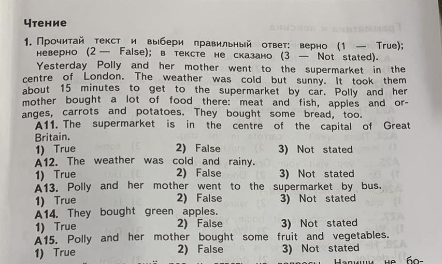 Вчера Полли с мамой отправились в супермаркет в центре Лондона. Погода стояла холодная, но солнечная. Им потребовалось около 15 минут, чтобы добраться до супермаркета на машине. Полли и ее мама купили там много еды: мясо и рыбу, яблоки и апельсины, морковь и картофель. Они также купили хлеба.
