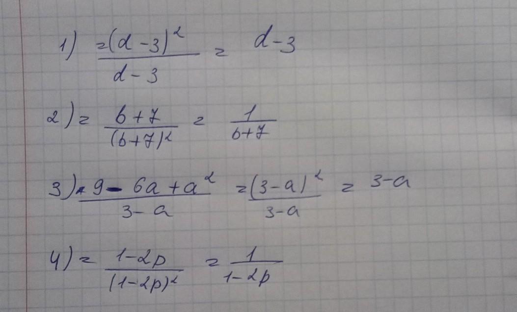 1) (d-3)^2 / d-3 = d-32) b+7/(b+7)^2 = 1/b+73) (3-a)^2 / 3-a = 3-a4) 1-2p / (1-2p)^2 = 1/1-2p