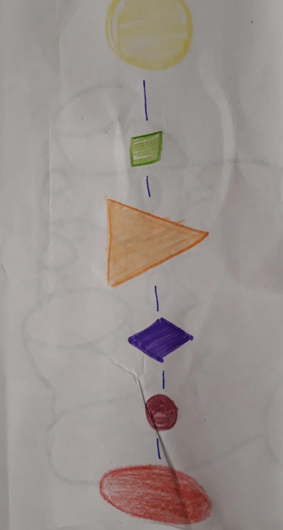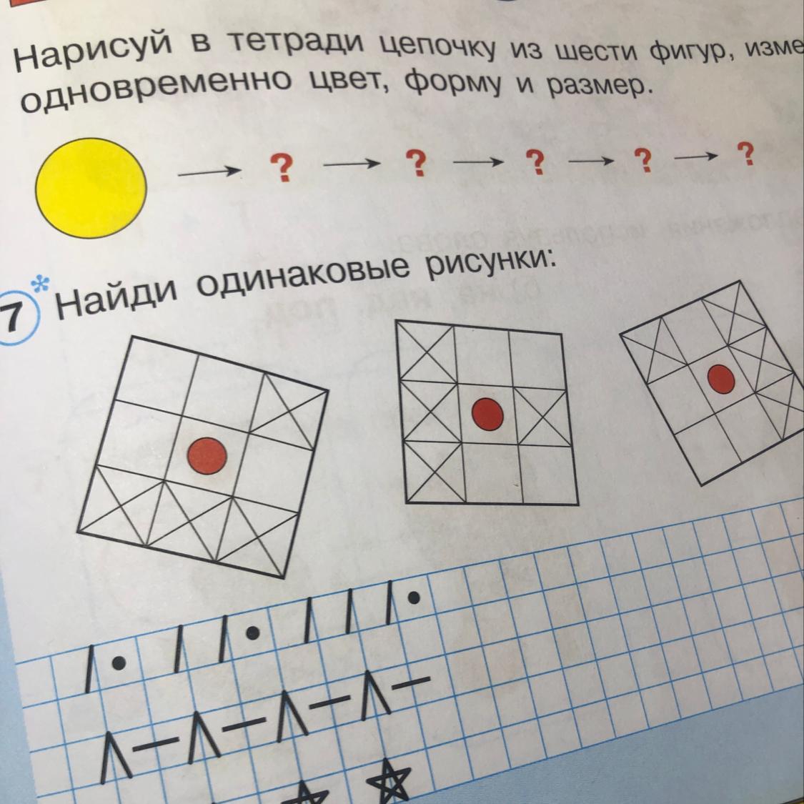 Нарисуй в тетради цепочку из шести фигур , изменяя одновременно цвет , форму и размер