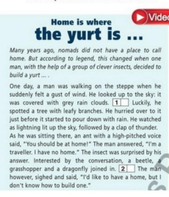 много лет назад noтads не было дома. Но, согласно легенде, все изменилось, когда один человек с помощью группы умных насекомых решил построить юрту ... Однажды человек шел по степи, когда внезапно почувствовал порыв ветра. Он посмотрел на небо: оно было покрыто серыми дождевыми облаками. 1 К счастью, он заметил дерево с лиственными ветвями. Он поспешил к нему как раз перед тем, как пошел ливень. Он видел, как небо осветила молния, за которой последовал раскат грома. Когда он сидел там, муравей с пронзительным голосом сказал: «Ты должен быть дома!» Мужчина ответил: «Я путешественник. У меня нет дома». Его ответ удивил насекомое. Заинтересовавшись разговором, к разговору присоединились жук, кузнечик и стрекоза. 2 Мужчина, однако, вздохнул и сказал: «Мне бы хотелось иметь дом, но я не знаю, как его построить».