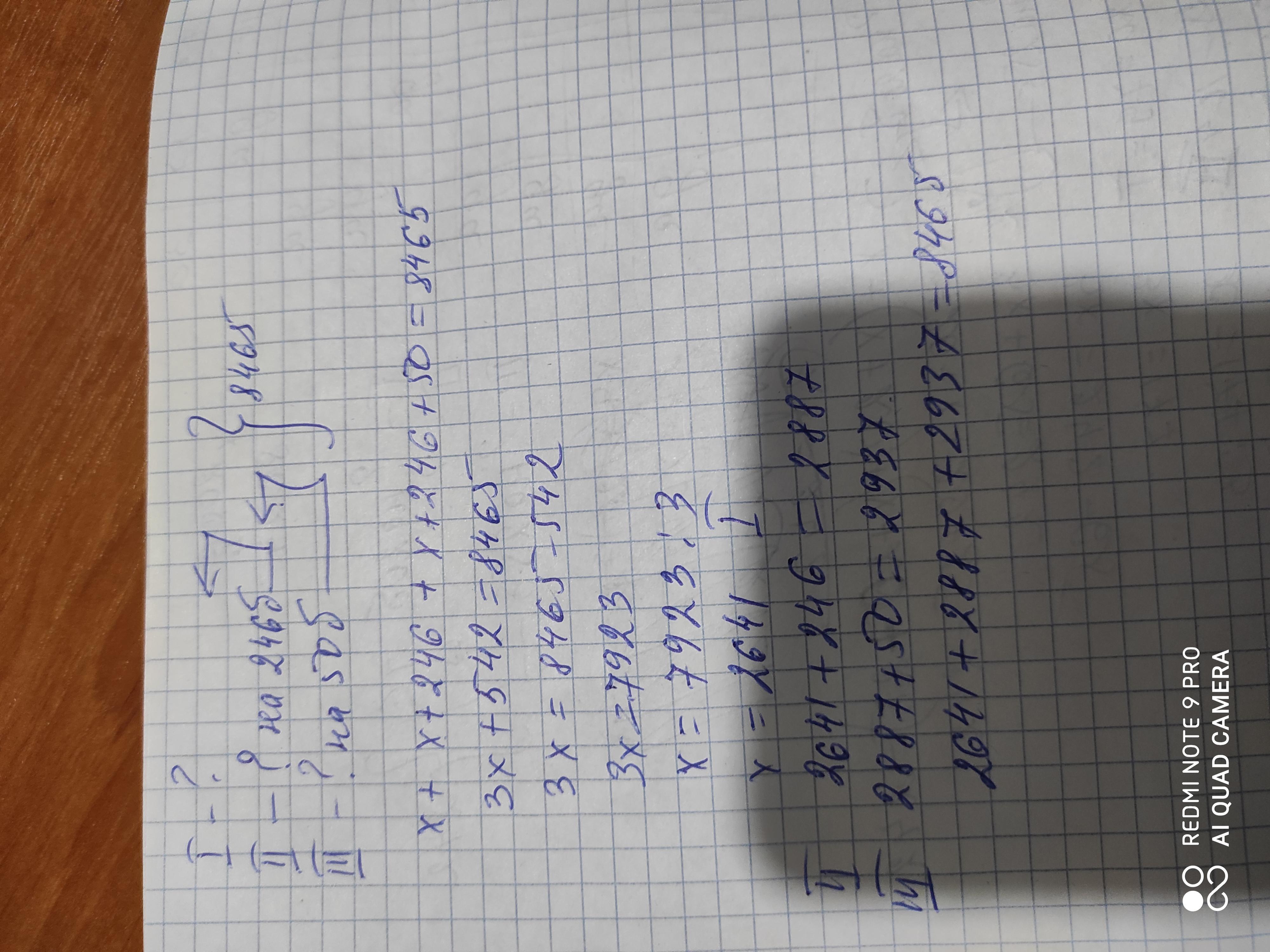 В трёх фермерских хозяйствах 8465 га земли..Во втором хозяйстве на 246 га больше ,чем в первом ,а в третьем на 50 га больше ,чем во втором.сколько га земли в каждом хозяйстве ?