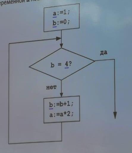 Изначально a = 1 b = 0. Проходит одна интерация цикла, у нас спрашивают равняется ли b четырем? Нет, тогда мы увеличиваем значение b на 1 b умножаем значение a на 2. 0 + 1 = 1, 1 * 2 = 2. Цикл запускаеся вновь, у нас опять b не равняется четырем, поэтому мы увеличиваем значение b на 1 b умножаем значение a на 2. 1 + 1 = 2, 2 * 2 = 4. Цикл запускаеся вновь, у нас опять b не равняется четырем, поэтому мы увеличиваем значение b на 1 b умножаем значение a на 2. 2 + 1 = 3, 4 * 2 = 8. Цикл запускаеся вновь, у нас опять b не равняется четырем, поэтому мы увеличиваем значение b на 1 b умножаем значение a на 2. 3 + 1 = 4, 8 * 2 = 16. Цикл запускается и видит, что b = 4 и выполняется Х действие. После выполнения цикла a = 16