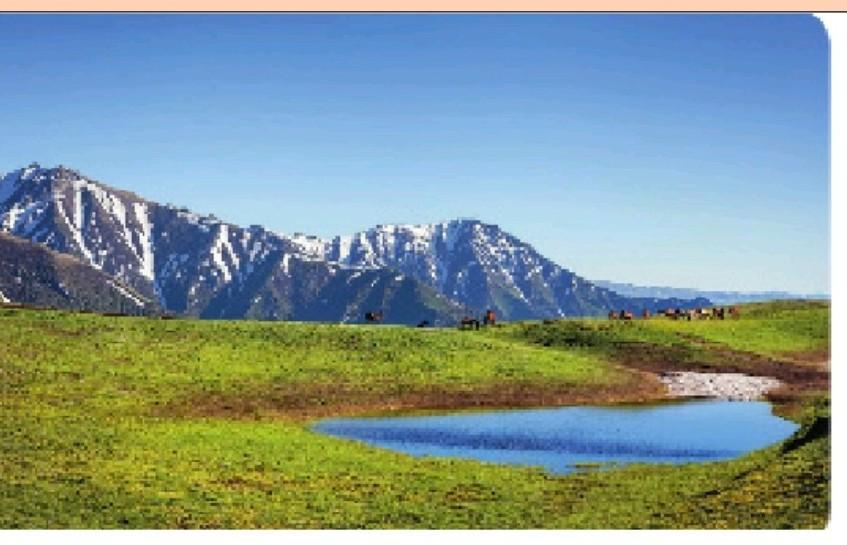 Бұл суретте мен қазақтың әдемі табиғаты көріп отырмын, көк аспан, жасыл шөптер, үлкен таулар, жылқылар, кішкентай көл.