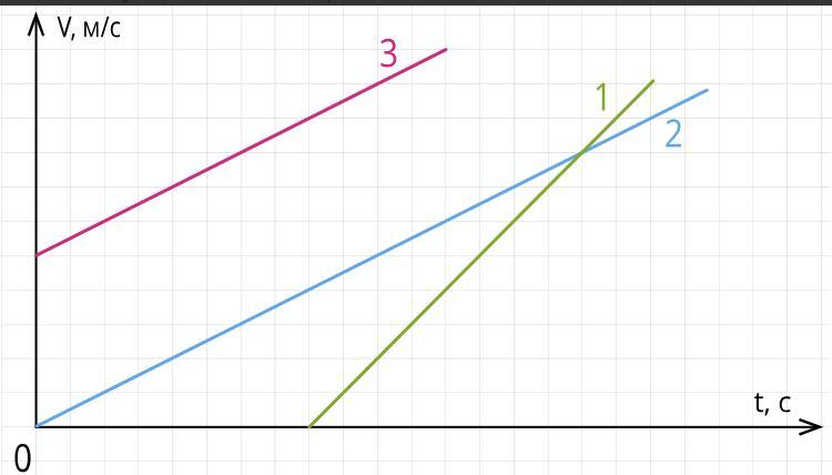 На рисунке 1 представлены графики зависимости от времени скорости трёх движущихся материальных точек. Внимательно рассмотри графики.