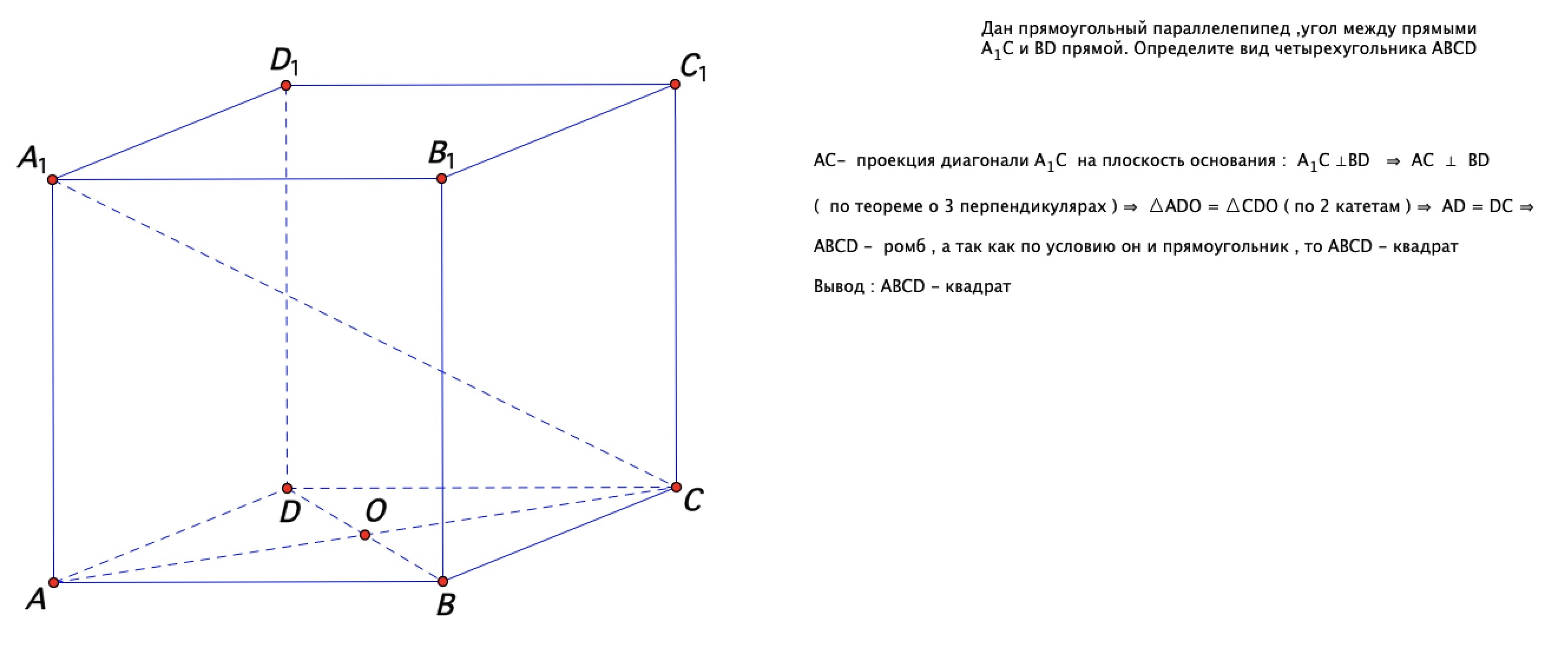 Дан прямоугольный параллелепипед ,угол между прямыми A1С и BD прямой. Определите вид четырехугольника ABCD