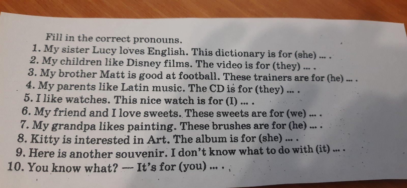 Нужно вставить объектные местоимения (object pronouns).