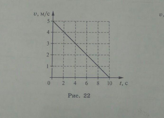 По графику зависимости скорости тела от времени, изображённому на рисунке 22, определите, чему равны начальная скорость тела, скорость тела через 10 с после начала движения, его ускорение и путь, пройденный телом за 10 с.
