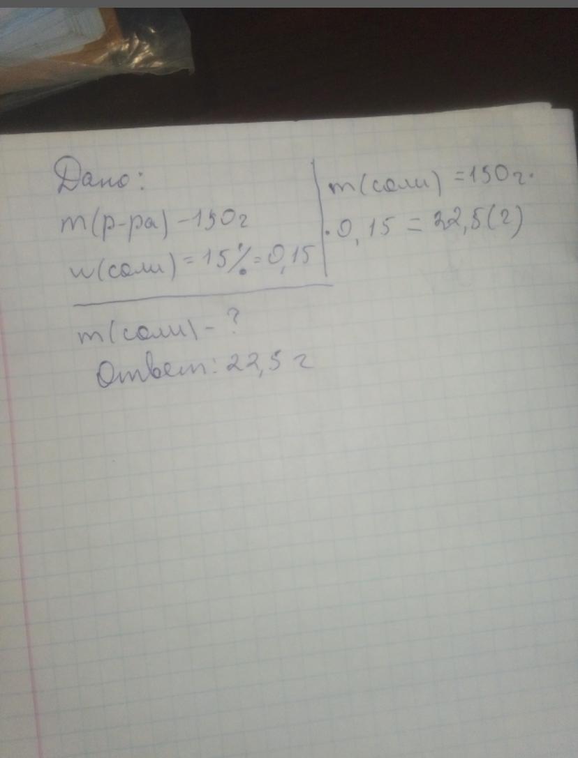Соль хлорида натрия массы(г) останется в чашке после выпаривания его раствора 150 г с массовой долей соли 15%. (Распишите пожалуйста подробно)