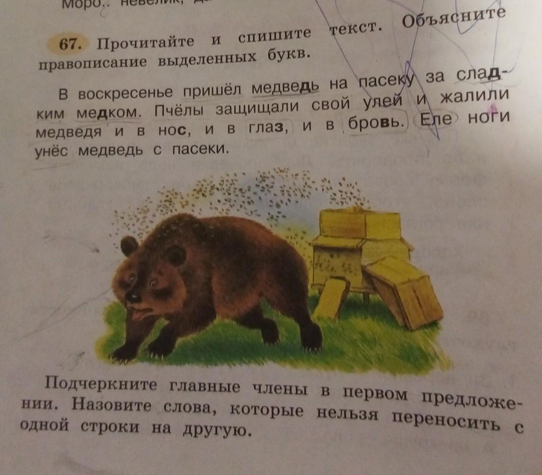 Ответ:Ответ:МедвеДь мы слышьим Т а пишем Д, проверочное медведик.Сладким, тоже слышим Т но пишем Д,провепочное сладенький. Медком тоже самое, проверочное- мёд. Глаз-слышим С пишем букву З проверочное- глазик. Бровь слышим Ф пишем В, проверочное-брови тут четко слышим В. Главные члены- медведь подчеркиваем одной линией, и пришел, подчеркиваем двумя линиями. Слова, которые нельзя перенести: еле, нос, бровь, глаз.
