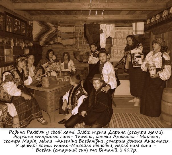 Rahiv'yan family is in their house. Leftward : aunt Darina( mum's sister ), wife of the eldest son - Tetyana, daughters Anzhelika and Marichka , sister Mariya , mother Anzhelina Bogdanivna , eldest daughter Anastasiya. In the centre of the house : dad Mihajlo Ivanovich , infront of him are sons Bogdan( eldest son ) and Vitalij. 1927 year