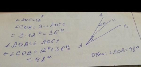 в) найдите величину угла АОВ, угол АОС=45^0, угол СОВ в 3 раза больше АОС