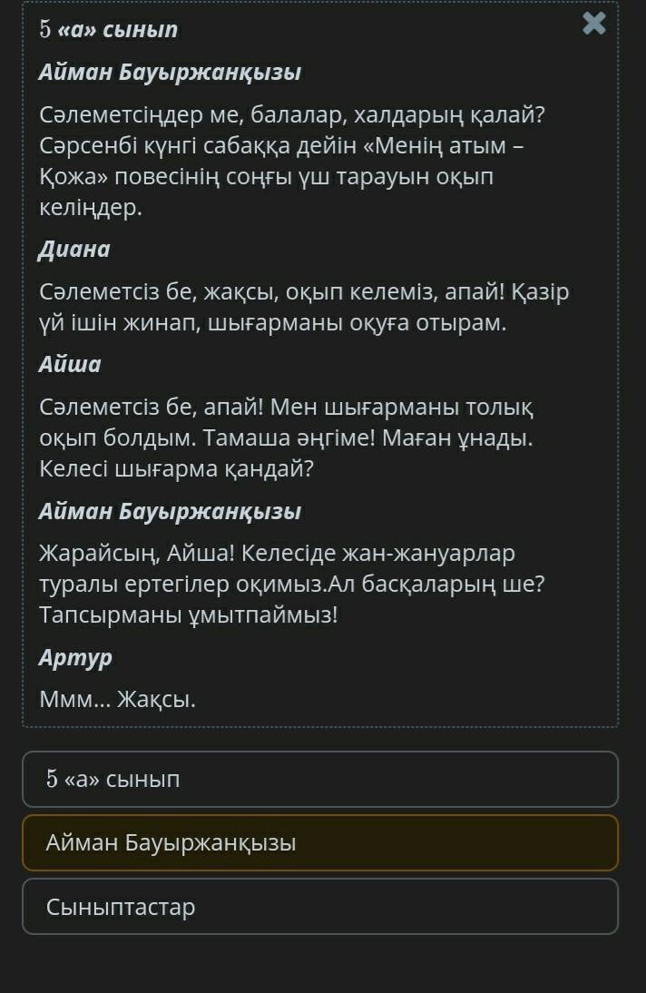 Жарайсың, Айша! Келесіде жан-жануарлар туралы ертегілер оқимыз.Ал басқаларың ше? Тапсырманы ұмытпаймыз!