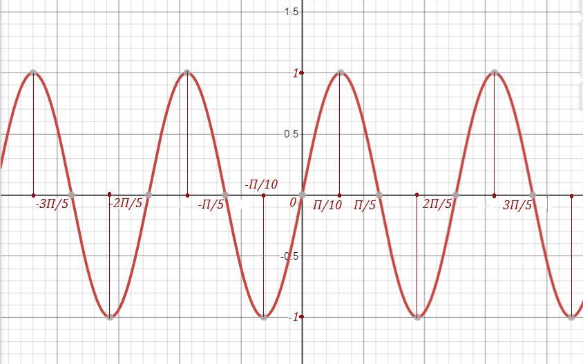Для построения графика функцию надо сжать в 5 раз. Например, нули заданной функции будут в точках . Отметив на оси ординат нули функции, можно легко нарисовать заданный график : между нулями функции отметить точки, соответствующие половинкам интервалов, и рисовать синусоиду.