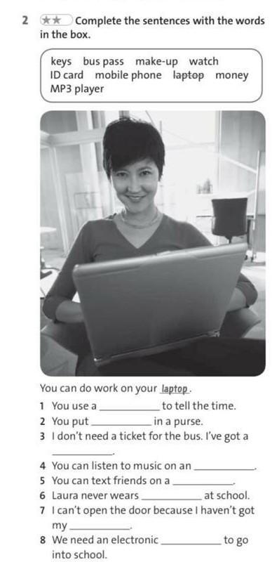 Ответ:1 watch, 2money, 3bus pass, 4MP3 player,5 mobile phone, 6 make-up 7 key, 8ID card