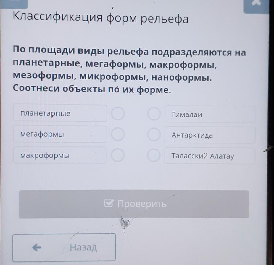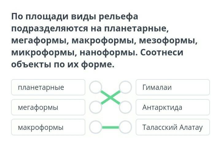 По площади виды рельефа подразделяются на планетарные, мегаформы, макроформы, мезоформы, микроформы, наноформы. Соотнеси объекты по их форме. ПОМОГИТЕ ПОЖАЛУЙСТА