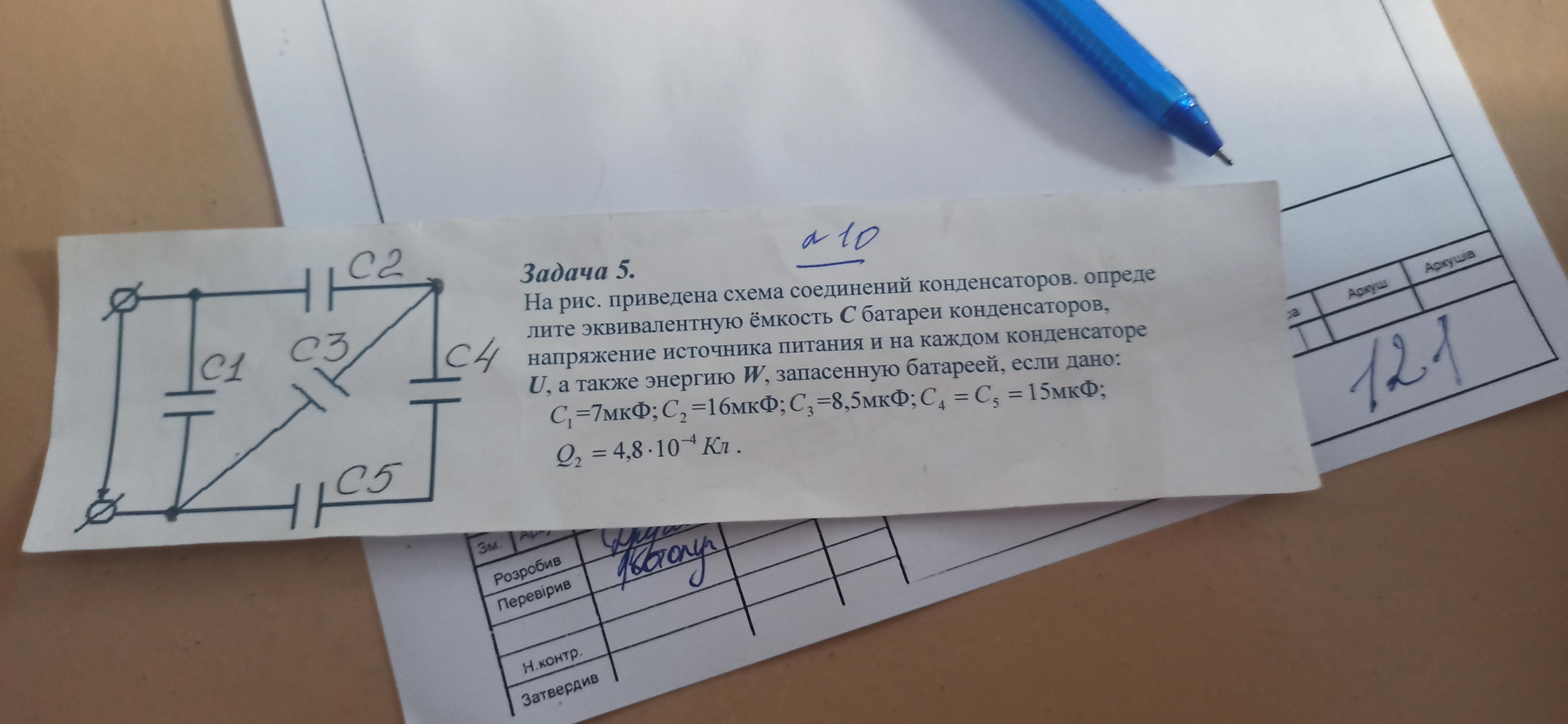 На рис. Приведена схема соединения конденсаторов. Определите эквивалентную ёмкость C батареи конденсаторов, напряжение источника питания и на каждом конденсаторе U, а также энергию W заплаченную батареи если дано: C1=7мкФ C2=16мкФ C3=8.5мкФ. C4=C5 = 15мкФ Q2= 4.8*10-⁴Кл