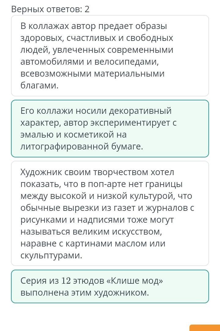 Определи, какие утверждения относятся к творчеству Ричарда Гамильтона. Верных ответов: 2 В коллажах автор предает образы здоровых, счастливых и свободных людей, увлеченных современными автомобилями и велосипедами, всевозможными материальными благами. Его коллажи носили декоративный характер, автор экспериментирует с эмалью и косметикой на литографированной бумаге. Серия из 12 этюдов «Клише мод» выполнена этим художником. Художник своим творчеством хотел показать, что в поп-арте нет границы между высокой и низкой культурой, что обычные вырезки из газет и журналов с рисунками и надписями тоже могут называться великим искусством, наравне с картинами маслом или скульптурами.