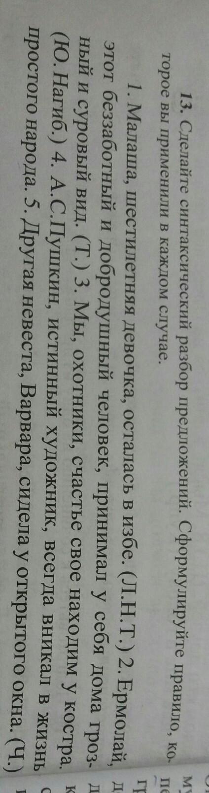 Малаша, шестилетняя девочка, осталась в избе(невоск., повест, осложн. дополнением, двусост). Ермолай, этот без работы и бездушный человек, принимал у себя дома(повест.невоскл.осложн дополненим, двусост). Грозный и Суровый и суровый вид. Мы, охотники, счастье свое находим у костра(повест,невоскл.,осложн дополнение, двусост.). А.С.П., истинный художник, всегда вникал в жизнь простого народа*невоскл, повест,сложнен дополнением). другая невеста,Варвара, сидела у открытого окна.(тоже самое)