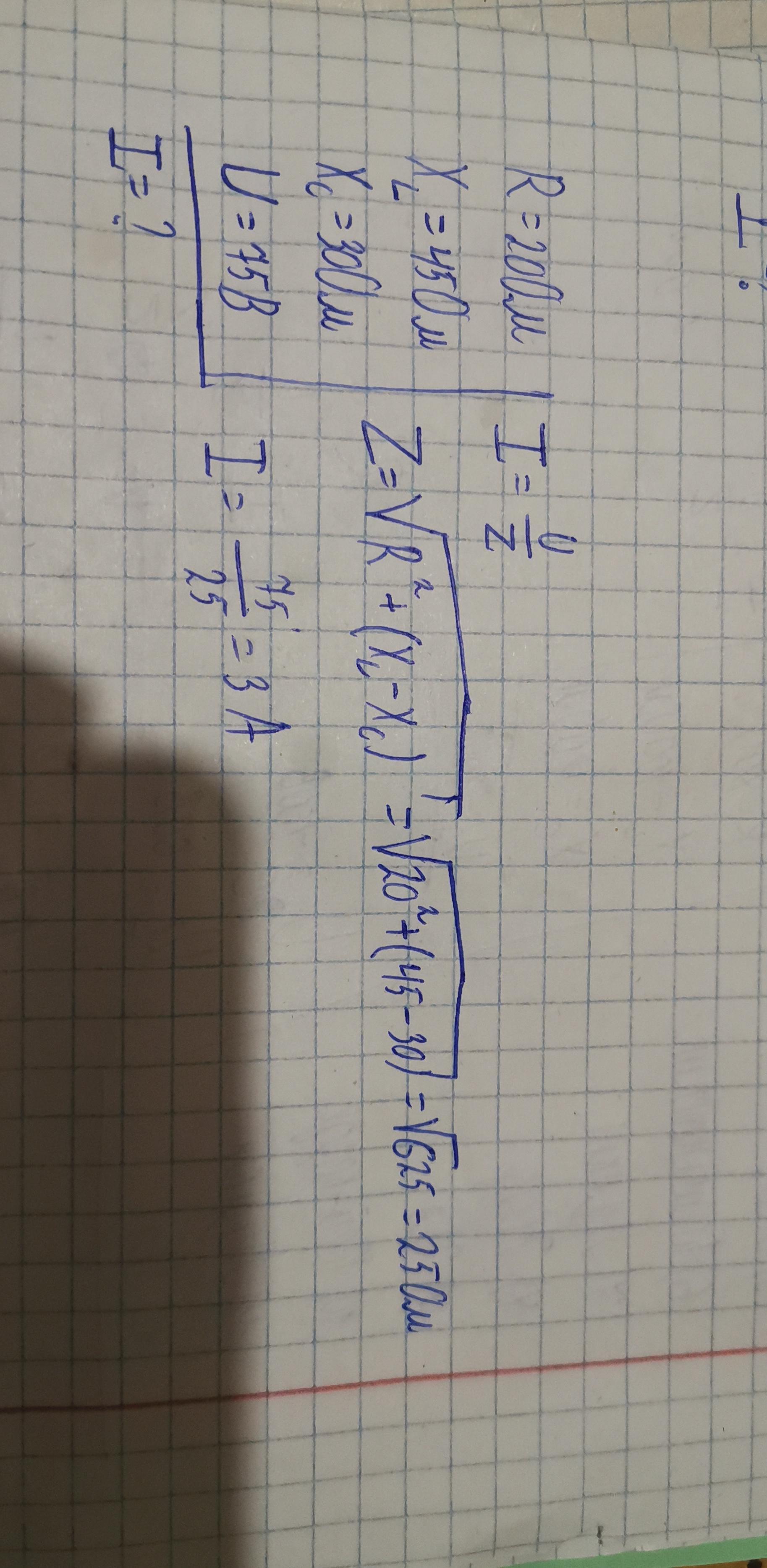 Последовательная электрическая цепь, состоящая из резистора с сопротивлением 20 Ом, катушки индуктивности с индуктивным сопротивлением 45 Ом и конденсатора с емкостным сопротивлением 30 Ом, подключена к источнику переменного напряжения с действующим значением напряжения 75 В. Определи действующее значение силы тока в цепи.