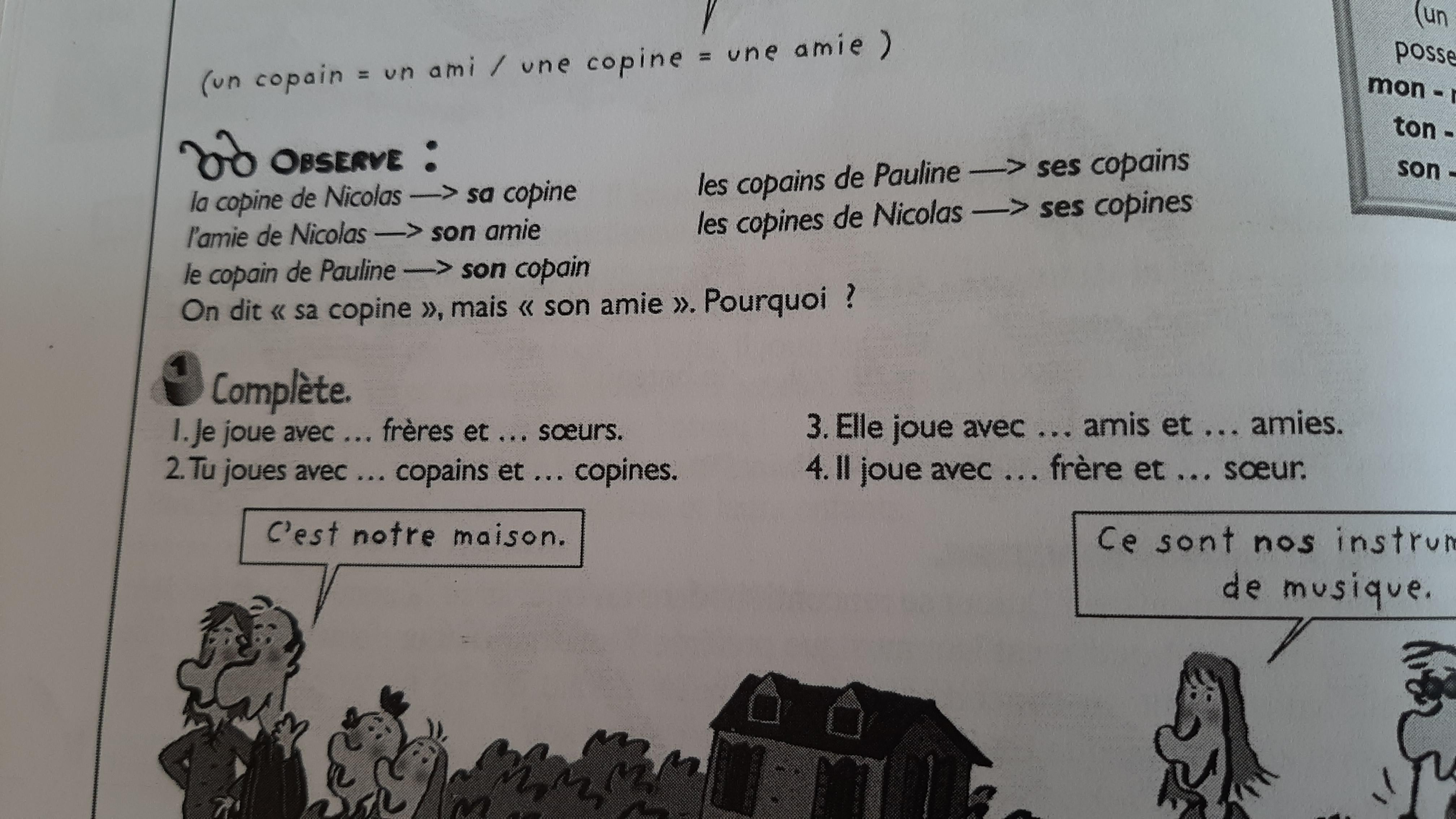 (причём, в отличие от русского языка, местоимения третьего лица (т. е. son и sa) согласуются не с "обладателем" предмета или лица, а с тем предметом или лицом, к которому относятся. Например, словосочетание "его мать" переводится как sa mère, а "её отец" - son père.)
