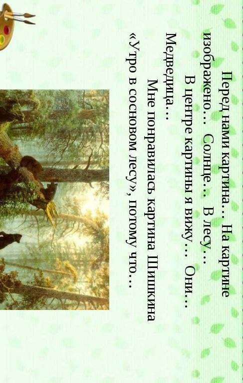 на картине изображены медьвижата Солнце в сосновом лесу в лесу медьвижата исследуют окрестности леса в центре картины я вижу утро которые только вышло из других краюв земли а вот медьвижата иследуют мир под строгим наблюдением мамы.