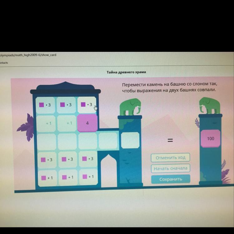 Перемести камень на башню со слоном так, чтобы выражения на двух башнях совпали.