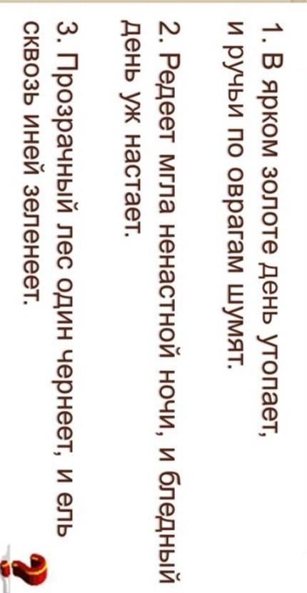 3) Лес (подлежащее) чернеет(сказуемое); иней(подлежащее), ель(подлежащее) зеленеет(сказуемое)