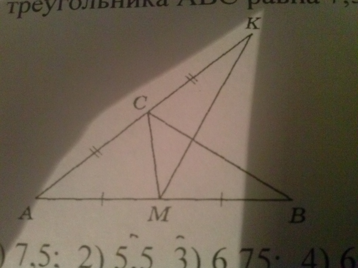 Точка М - середина стороны АВ треугольника АВС, а вершина С - середина отрезка АК. Найдите площадь треугольника СКМ, если площадь треугольника АВС равна 7.5 см.