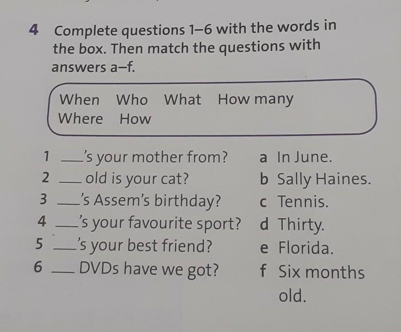 Complete questions 1-6 with the words in the box Then match the questions with answers a-f.
