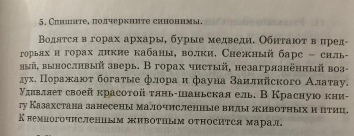 Спишите, подчеркните синонимы.Водятся в горах архары, бкрые медведи.Обитают в предгорьях и в горах дикие кабаны, волки.Снежный барс-сильный, выносливый зверь.В горах чистых и т.д.Помогите пж