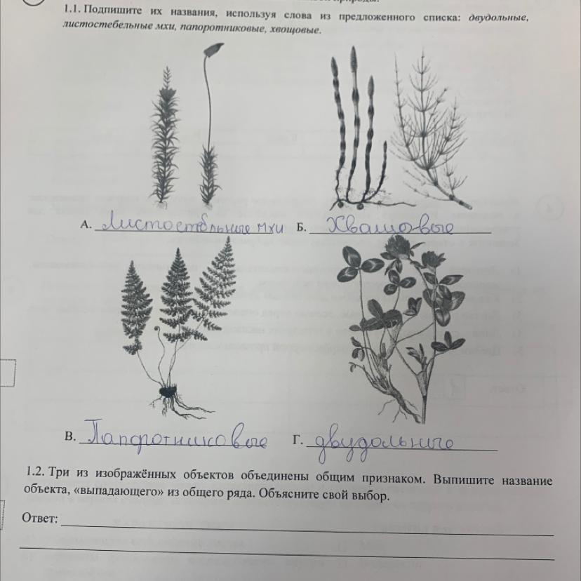 1.2. Три из изображённых объектов объединены общим признаком. Выпишите название