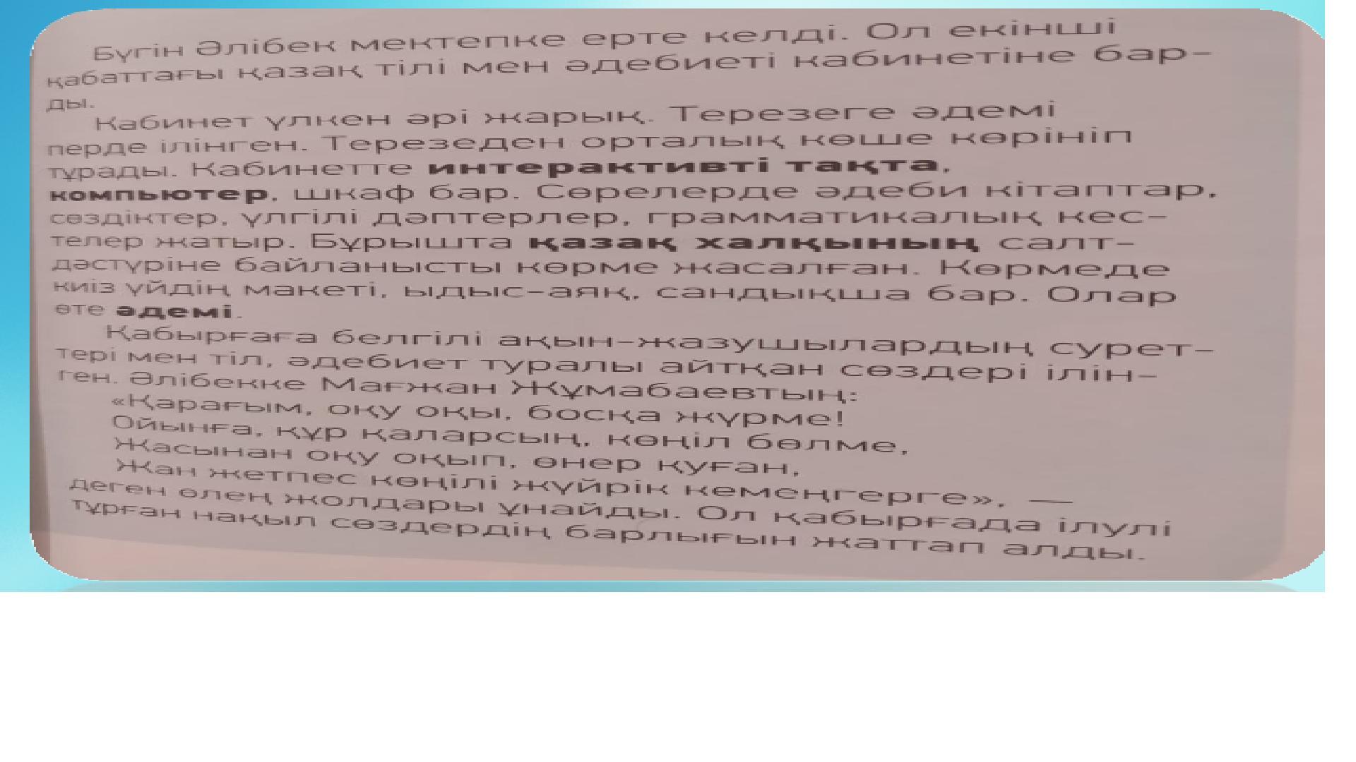 Мәтіннің мазмұны бойынша берілген сұрақтарға жауап беріндер. Дәптерге
