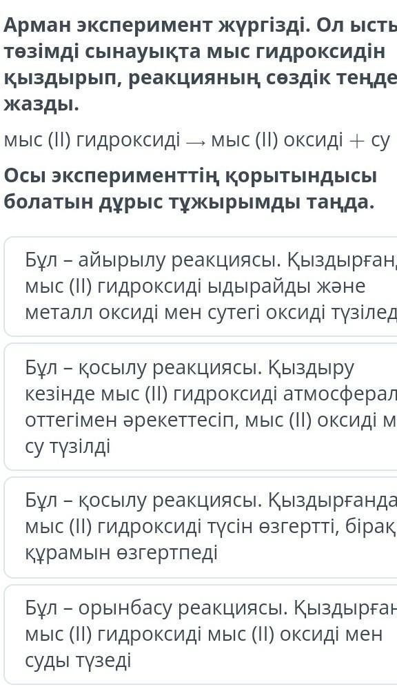 Арман эксперимент жүргізді. Ол ыстыққа төзімді сынауықта мыс гидроксидін қыздырып, реакцияның сөздік теңдеуін жазды.