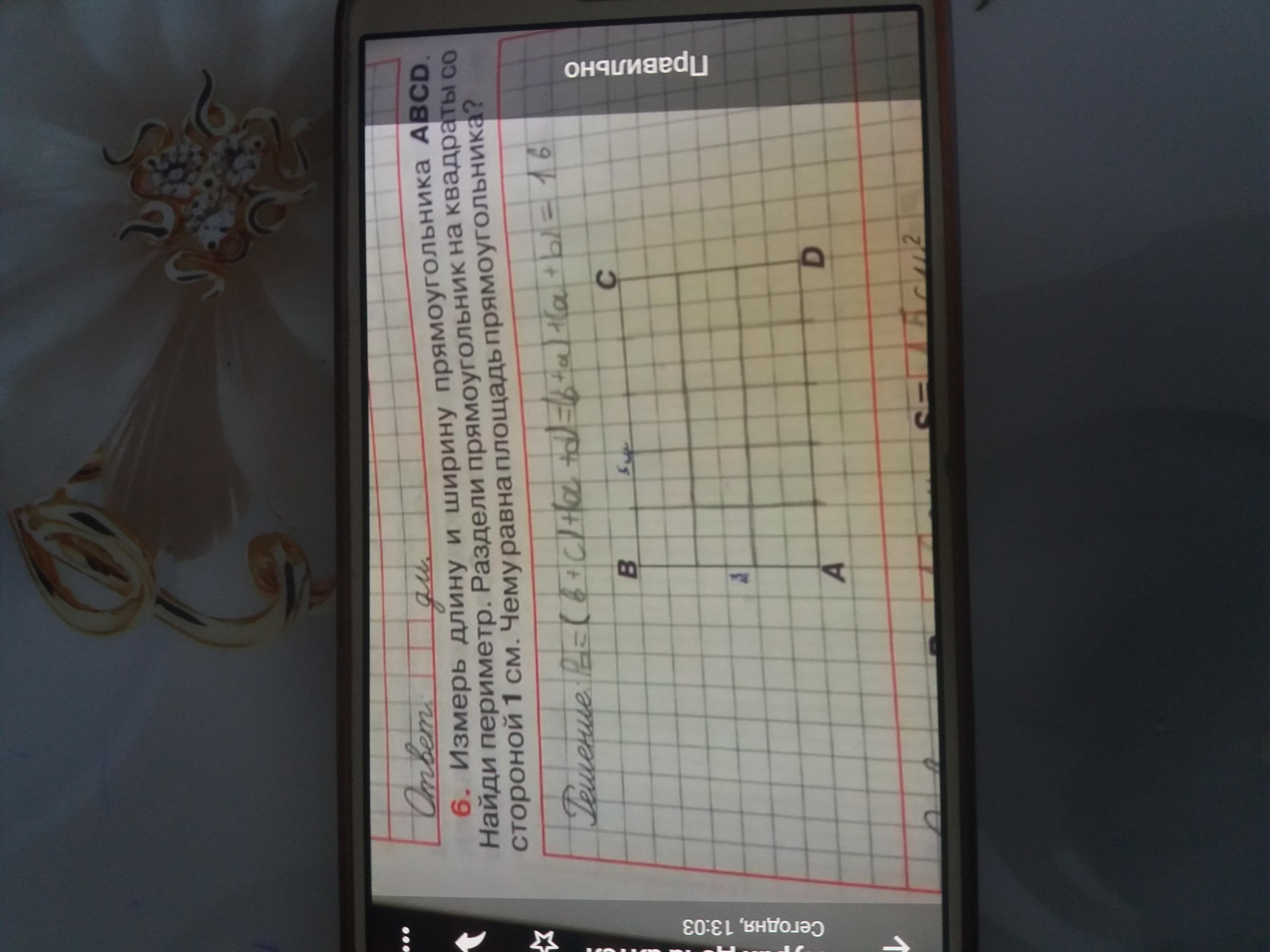 Измерь длину и ширину прямоугольника АВСД.Найди периметр.Раздели прямоугольник на квадраты со стороной 1см.Чему равна площадь прямоуголика?