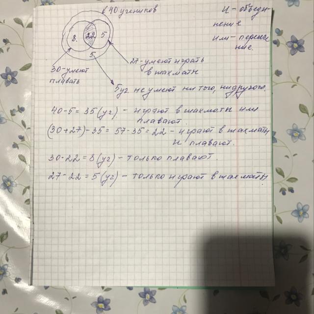 Из 40 пятиклассников 30 умеют плавать, 27 умеют играть в шахматы и только пятеро не умеют ни того, ни другого. Сколько пятиклассников умеют плавать и играть в шахматы?