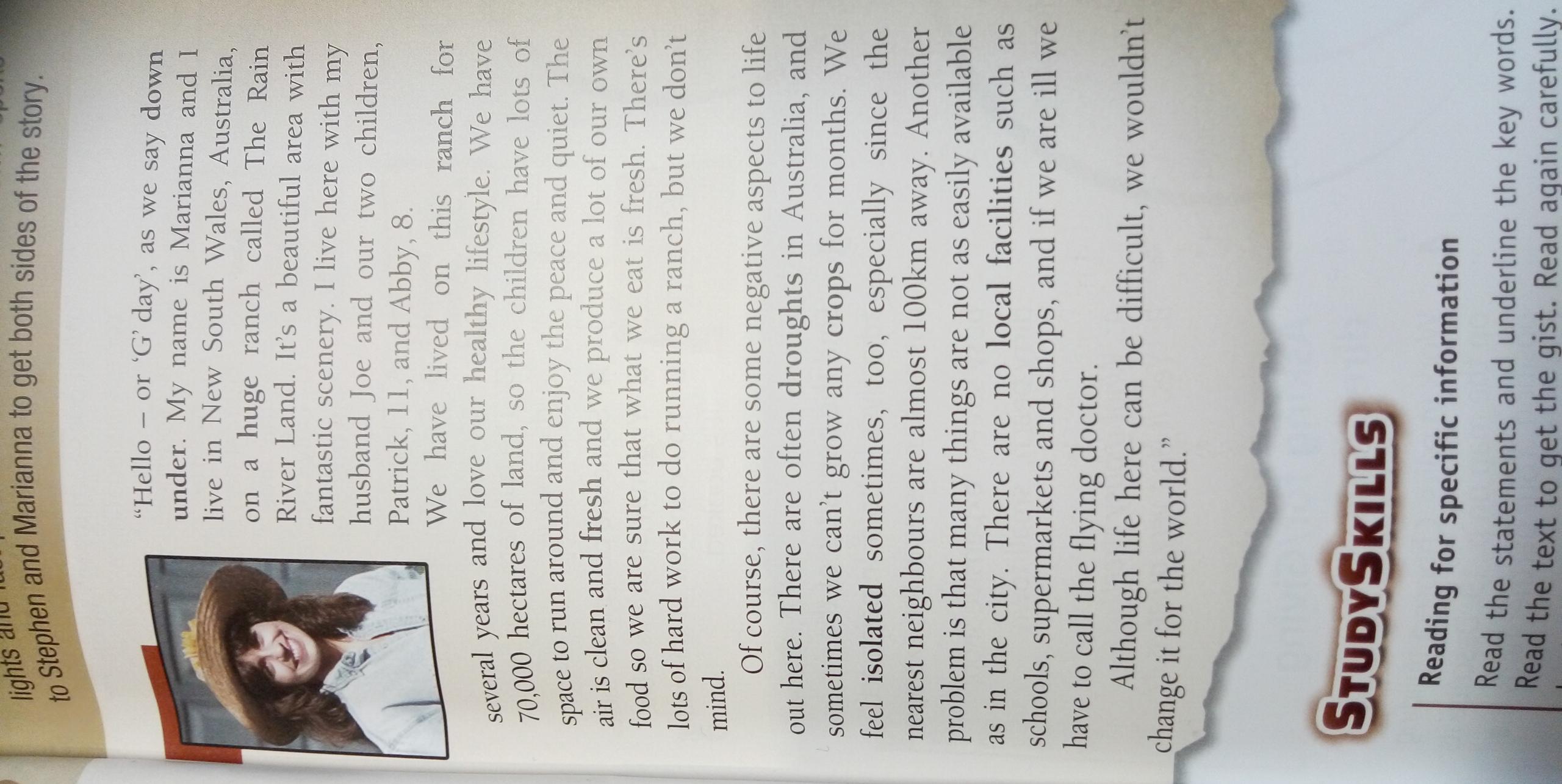 «Привет - или Добрый день, как мы говорим внизу. Меня зовут Марианна, и я живу в Новом Южном Уэльсе, Австралия, на огромном ранчо под названием The Rain River Land. Это красивая местность с фантастическими пейзажами. Я живу здесь со своими муж Джо и двое наших детей, Патрик, 11 лет, и Эбби, 8 лет. Мы жили на этом ранчо в течение