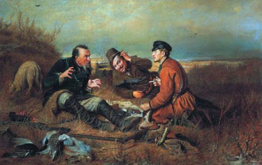 В самом центре полотно художник изобразил трех главных героев - это охотники. Глядя на них можно сказать, что они разного возраста. Тот, который по старше, одет в высокие черные сапоги, серые брюки в клеточку и черное длинное пальто. На его лбу глубокие морщины. По его мимике можно сказать, что он пытается донести какую-то серьезную информацию, по всей видимости, он хочет приукрасить ее, но не все мужчины ему верят. На его лице Длинные седые усы. Волосы на голове редкие и уже с сединой. В самом центре лежит, упершись на руку мужчина, он немного моложе первого героя. Одет в темное пальто. На нем выделяется красный пояс. На его голове шляпа, которая прикрывает русые, слегка длинные волосы. Глядя на лице, видим ухмылку. Возможно он не верит мужчине, который пытается рассказать какую-то историю из охоты. Его рука чешет затылок, тем самым показывает недоверия к оратору.