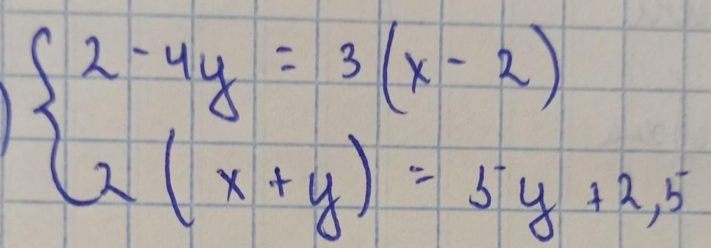 \left \{ {{2-4y=3(x-2)} \atop {2(x+y)=5y+2,5}} \right. \\\\\left \{ {{2-4y=3x-6} \atop {2x+2y=5y+2,5}} \right.\\\\\left \{ {{3x+4y=8}|*(3) \atop {2x-3y=2,5}|*4} \right.\\\\+\left \{ {{9x+12y=24} \atop {8x-12y=10}} \right.\\ -------\\17x=34\\\\x=2\\\\4y=8-3x=8-3*2=2\\\\y=0,5\\\\Otvet:\boxed{(2;0,5)}