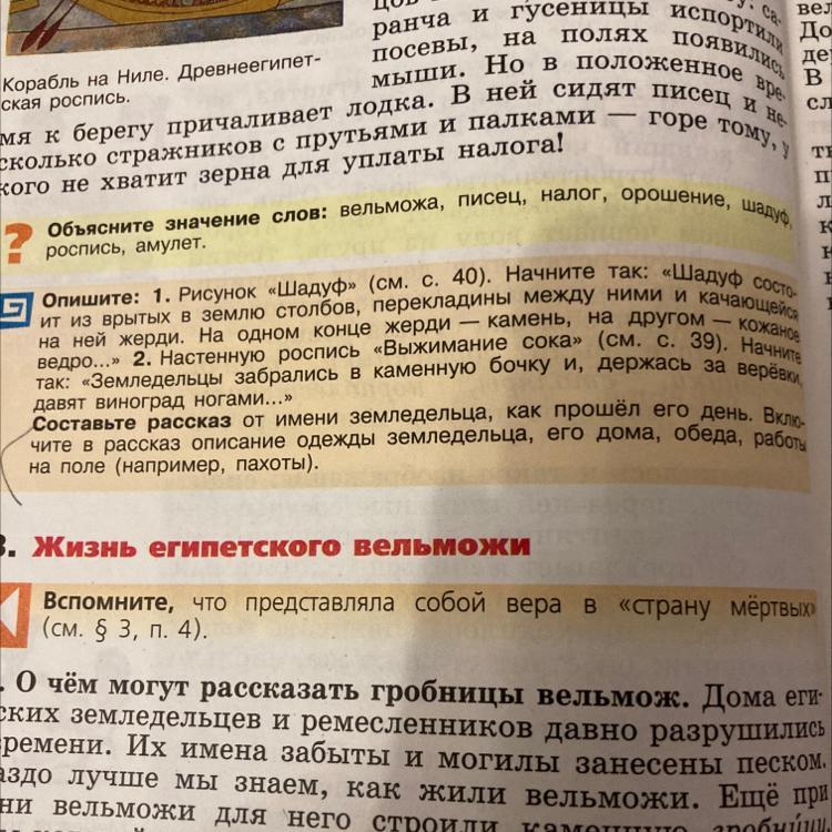 день начинается с того, что землю нужно сначала подготовить к пахоте. Сначала нужно построить земляные насыпи. Во время разлива вода застаивалась в квадратах, влага впитывалась а плодородный ил остался. Теперь земля готова к пахоте. Для орошения полей мы копаем каналы, а поливаем сады с помощью шадуфов. Некоторые земледельцы занимаются выжиманием виноградного сока для вина.