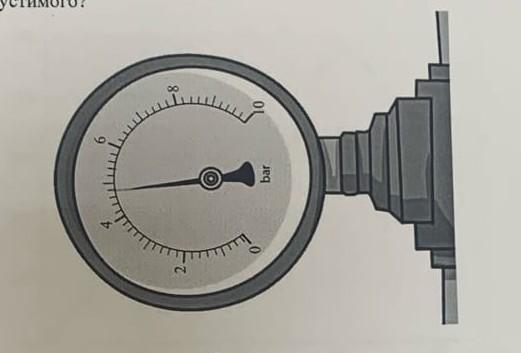 Давление в системе холодного водоснабжения многоэтажных домов по правилам не должно превышать 5 бар. Вася посмотрел на манометр, присоединённый к трубе подачи холодной воды, шкала которого показывает давление в бар. На сколько давление воды в трубе меньше максимально допустимого?