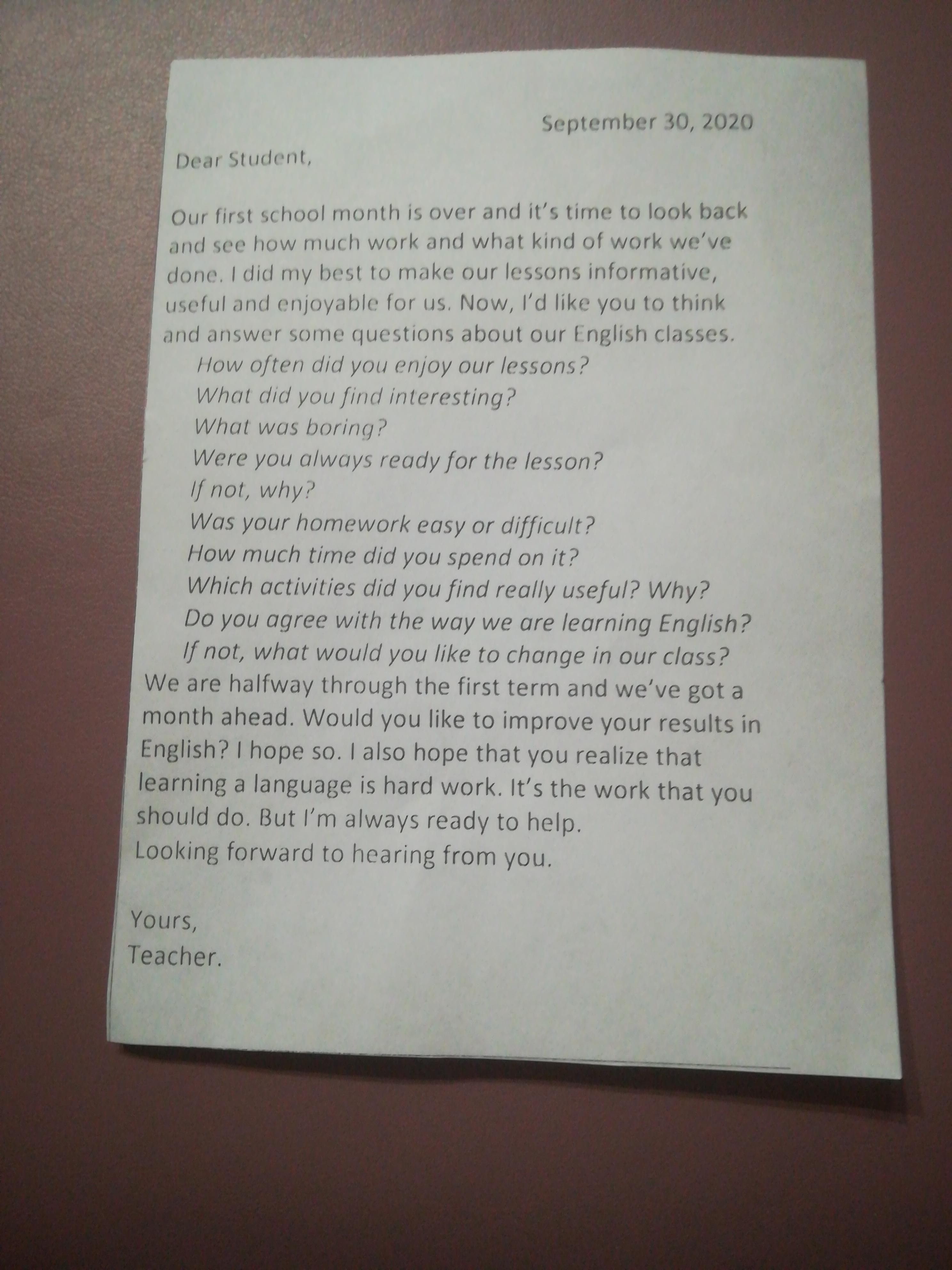 My English lessons are very interesting and useful. It is a very interesting because I like to learn something new. Your lessons not boring at all. I try to be ready for your lessons and get a good grade. The good grade needs to work hard and to make my homework on time. It is not easy because it is not my native language, but I try my best. I spend a couple of hours for homework every time. One of my favorite activities is to write a letter to my teacher. My teacher is a very intelligent and creative, so she is always find for her students the best way to teach English. I have only one month to improve my results, so I will work very hard to achieve my goal.