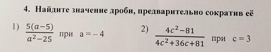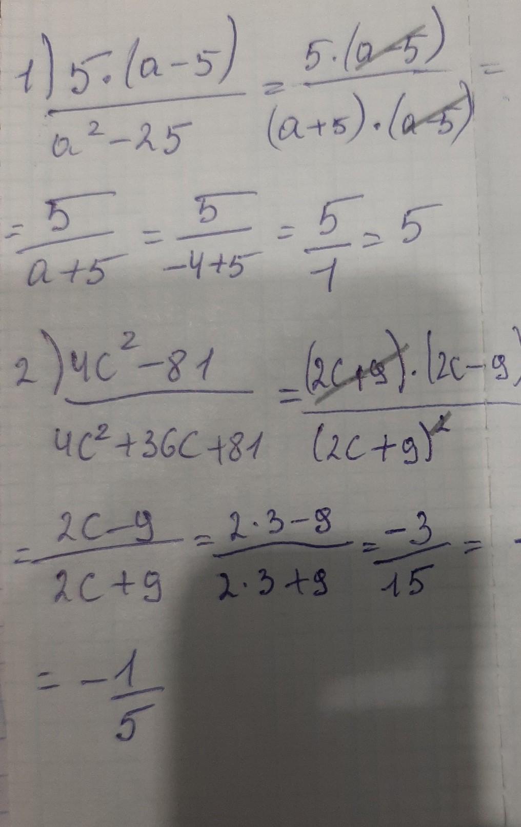 1) снизу раскладываем по разности квадратов получаем (а-5)(а+5), сокращаем и получаем дробь 5/(а+5) подставляем получаем ответ 5